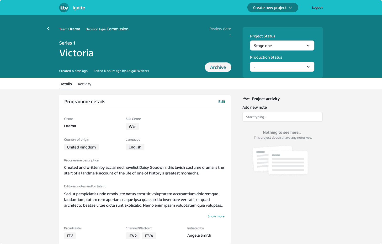 Ignite now consolidates customised data to accelerate ITV's complex, cross-departmental decision-making regarding its high-value investments in new TV and film productions. By keeping track of projects through different stages and steps in a systemised way, users can pull better reports and make better decisions when it comes to whether ITV should invest in distributing and/or streaming content.